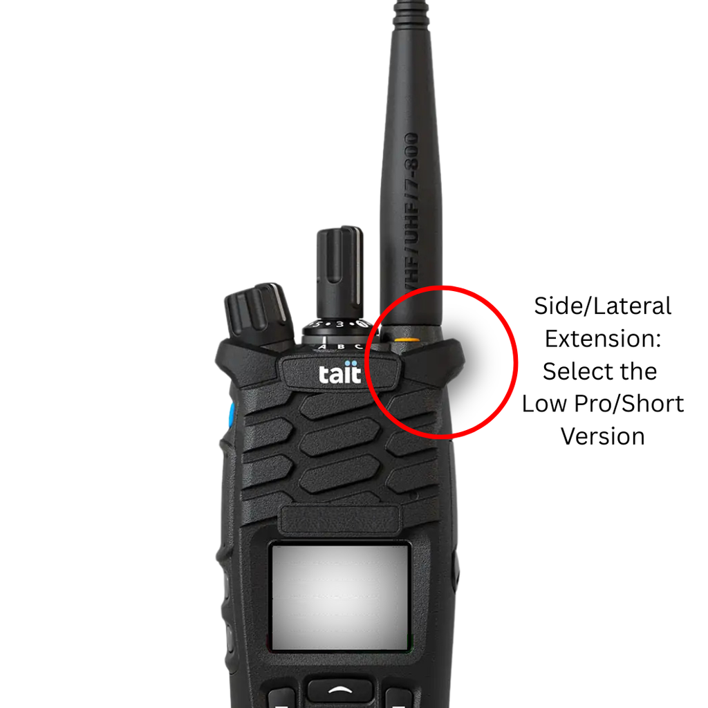 Radio profiles vary by model. If your Tait radio has a side/lateral extension near the top of the radio, select the low pro/short version for proper clearance and fit.