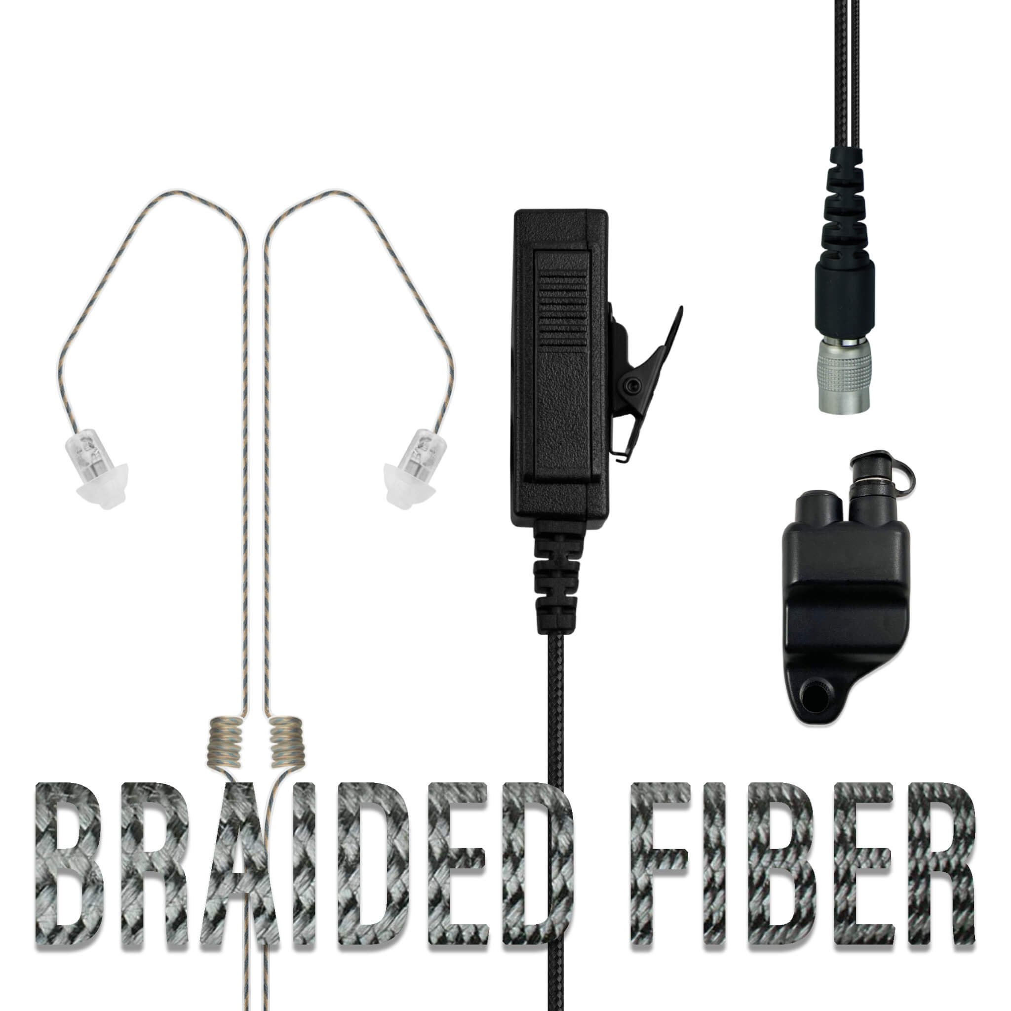 Braided Fiber Tactical Mic & Dual Ear Invisible Series Tubeless Earpiece Kit w/ Quick Disconnect (Hirose) - Harris: All P5300 P5400 P5500 P7300 Series, XG-15/25/75, XL-45, XL-95 & More